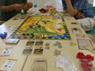 順番のセリをし、決められたアクションを行っていく。出てくる要素が色々おかしく、ピラミッドを立て、建物を造り、鉄道を引く。建物のコストを鉄道を使って輸送し、収益を上げる。ここまで書くとごく普通だが、建物のコストは果物wいったい何を如何すればライムやレモンで市役所が建つのかわからないが、そんなことを真面目に計算し、行うゲームです。出てくるアクションカードによってゲーム展開が変わるが、順番のセリのおかげで場のコントロールが運だけによることもなく、ゲームバランスは非常によい。またやりましょう。